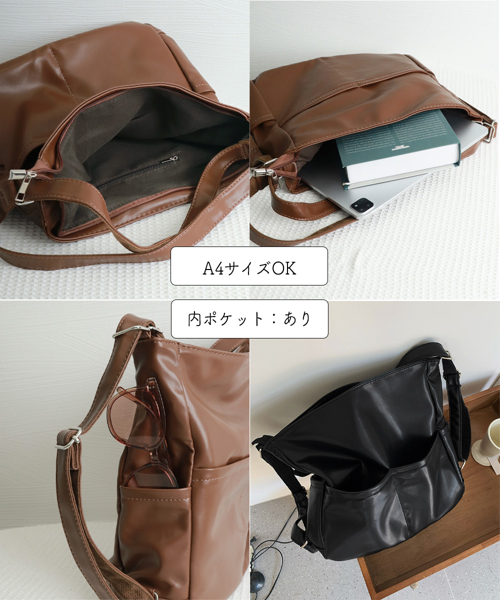 素材:合成皮革+ポリエステルカラー:ブラック/アイボリー/ブラウンサイズ:高さ:約31cm 上横幅:約30cm 底横幅:約24cm マチ:約9.5cm ショルダー:約112-132cm(調節可能、取り外し不可)収納について・A4対応(22×31cm):〇・ipadmini対応(19.6×13.5×0.7cm):〇・長財布(10×20cm):〇・二つ折り財布:〇・キーケース:〇・ペットボトル横向き(500ml):〇・ペットボトル縦向き(500ml):〇重さ:約401g裏地:あり内ポケット:あり※すべて平置きサイズです(採寸方法違いより、多少の誤差がございますので、ご了承ください)。