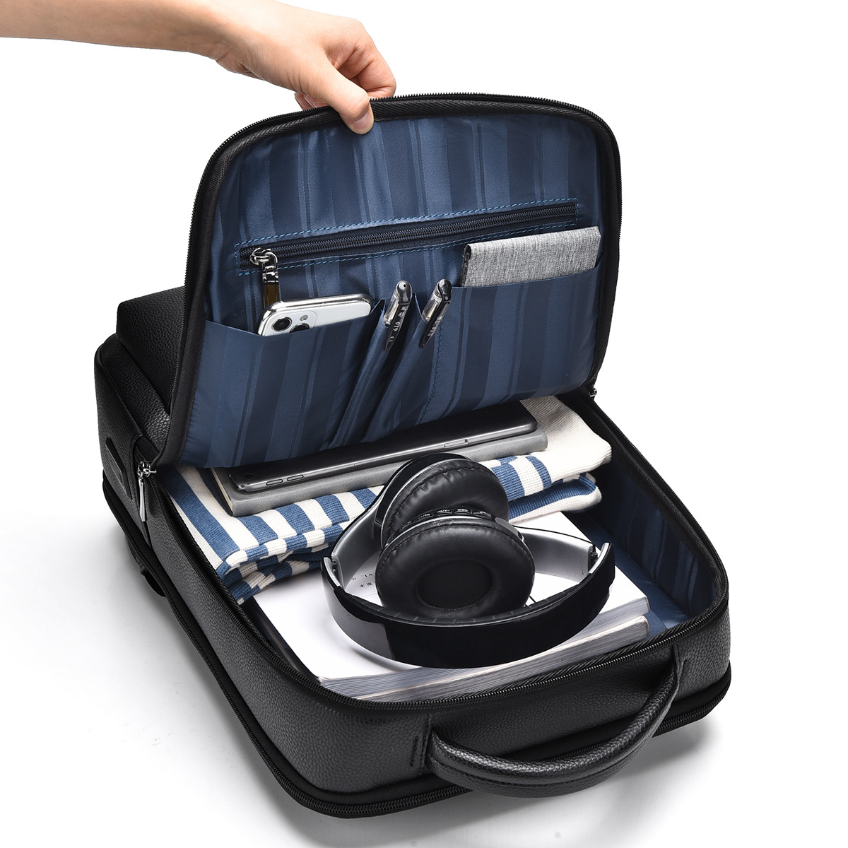 前面と底部にファスナーポケットを配置し収納力も抜群です。