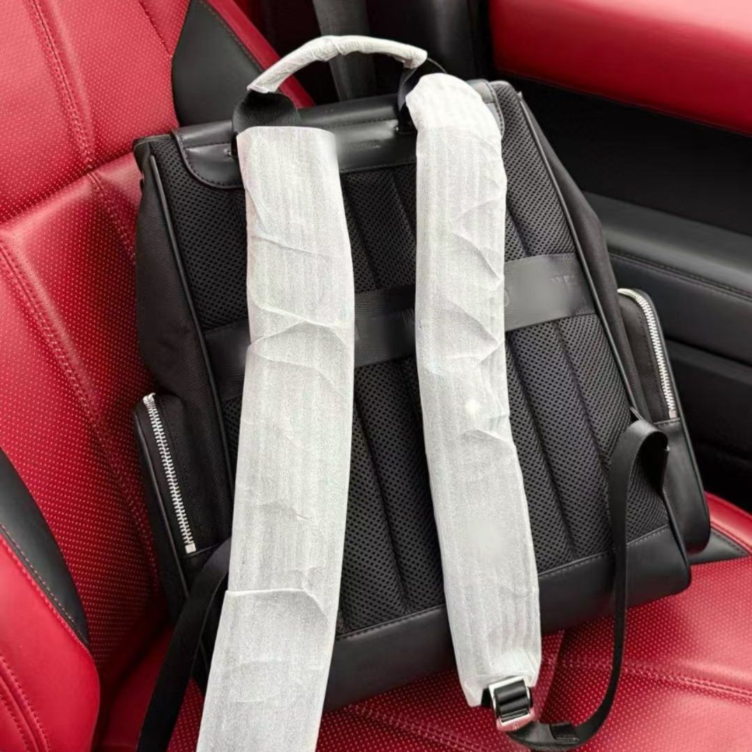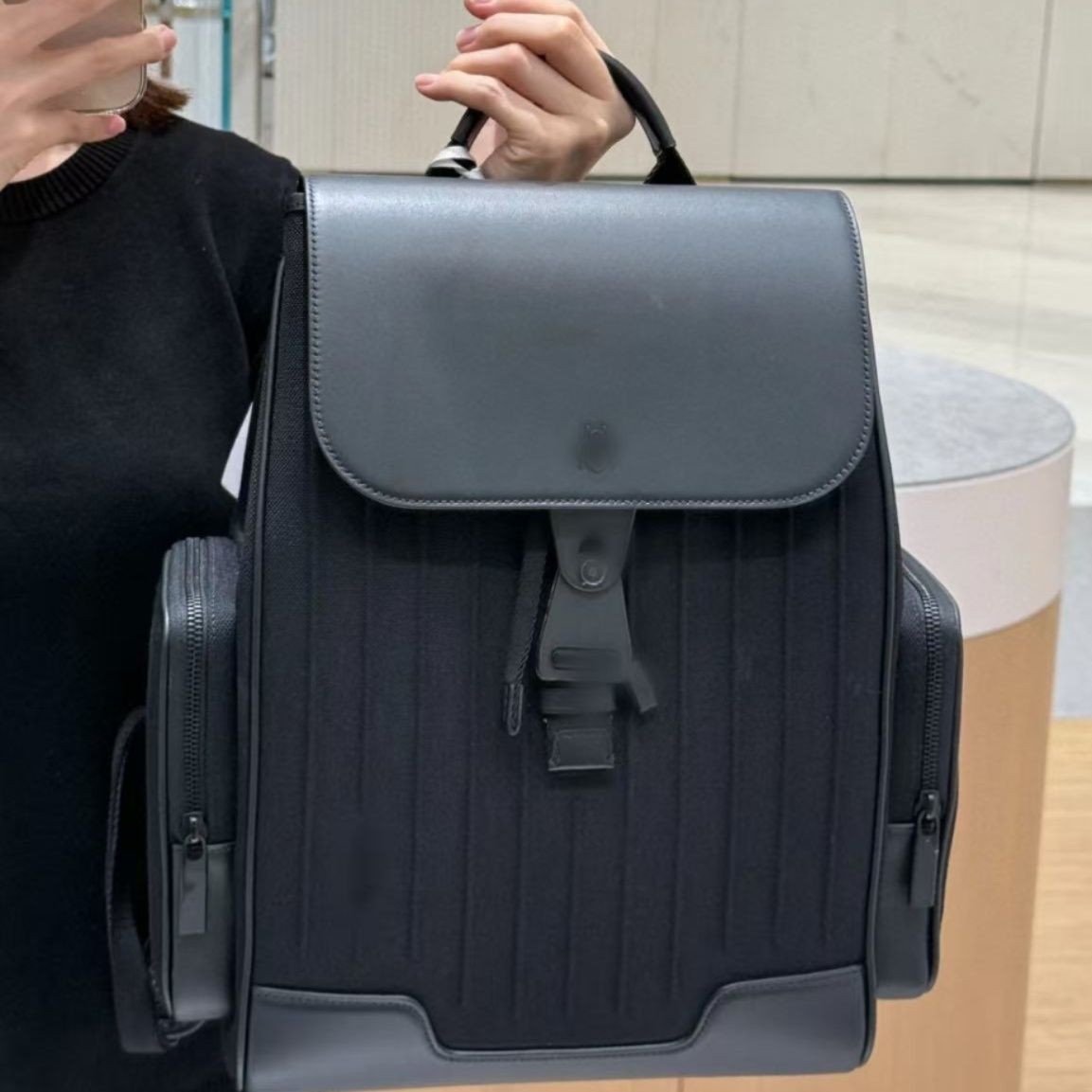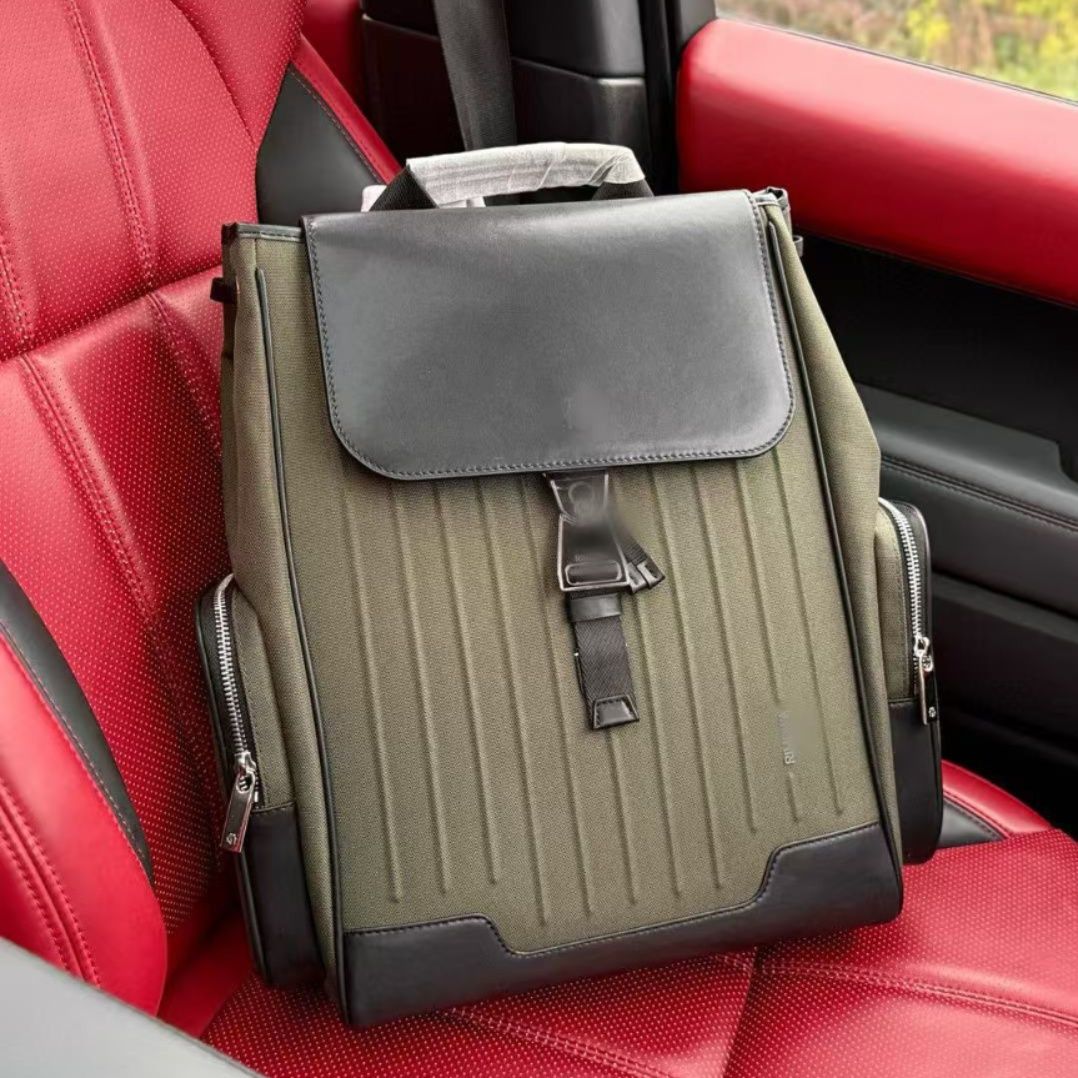 縦のストライプ型押しが施された上品なレザーリュックです。