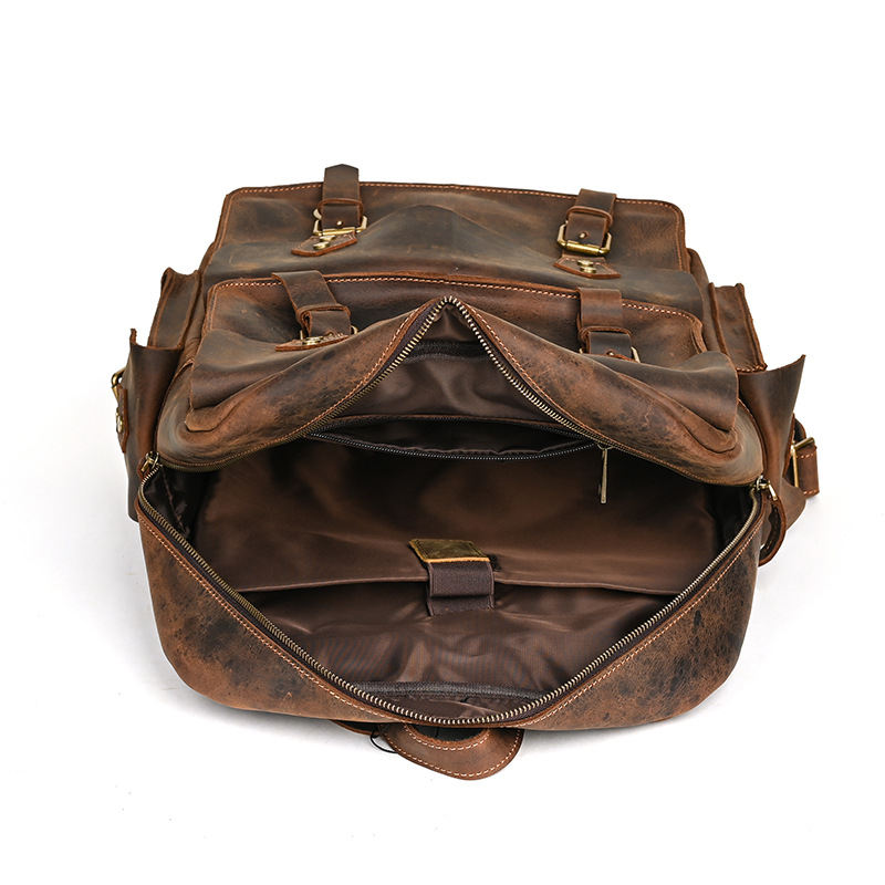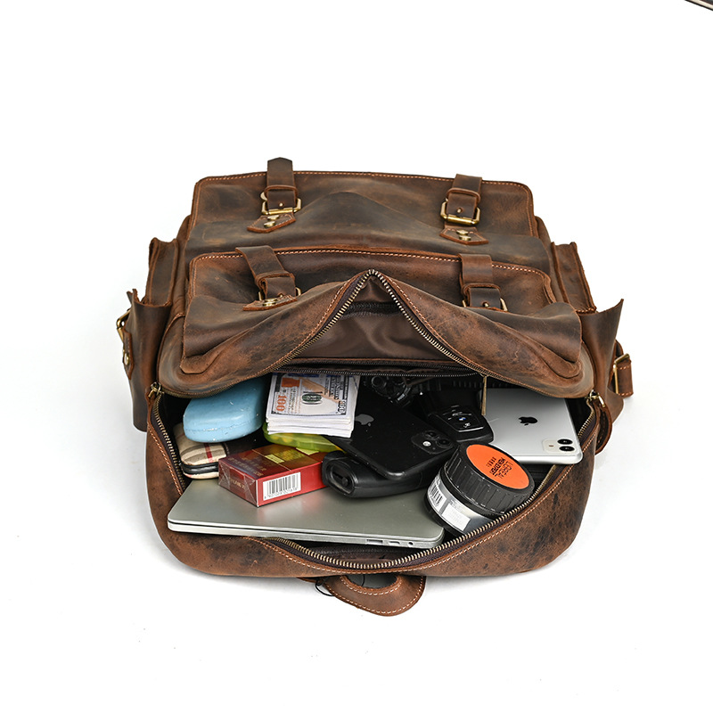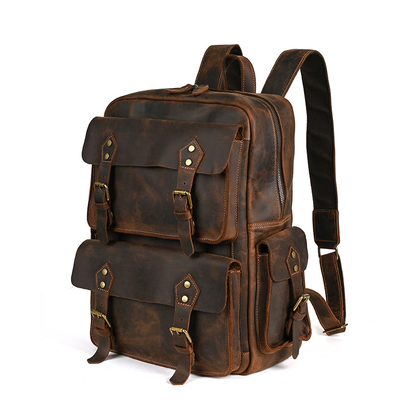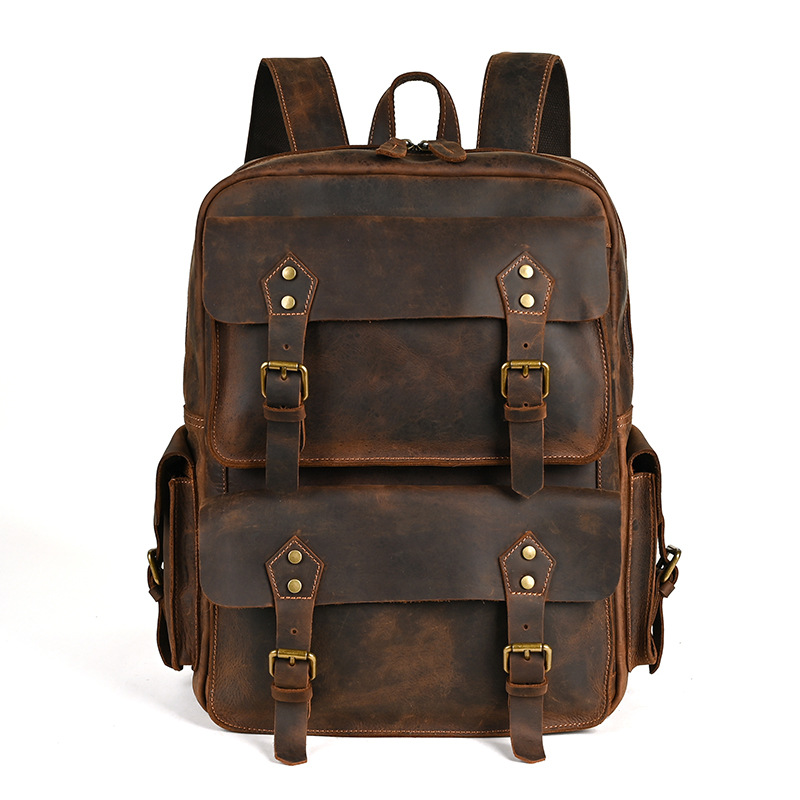 前面に配置された4つのベルトと金具が重厚感とヴィンテージ感を演出し、個性的なスタイルを実現します。