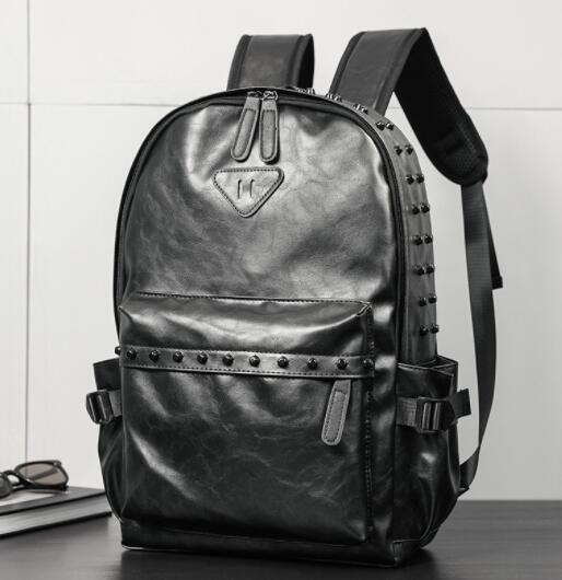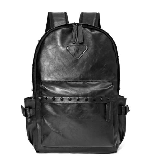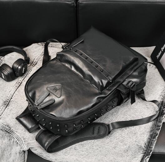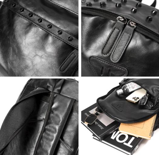 スタイリッシュなブラックレザーリュックで、おしゃれなスタッズデザインが特徴です。