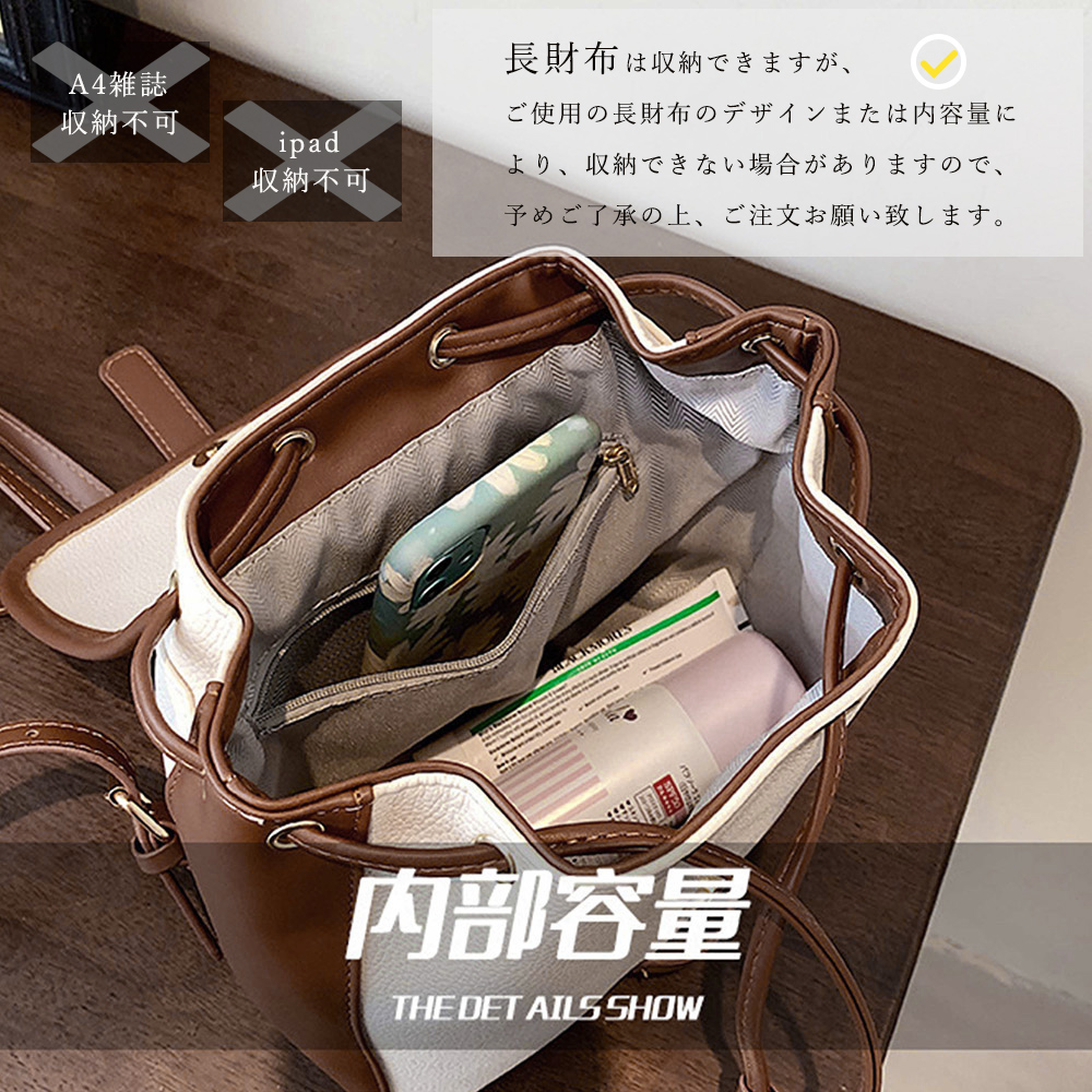 素材:合成皮革+ポリエステル カラー:ブラック/モカ/アイボリーブラウン/アイボリーベージュ サイズ: 高さ:約21cm 底横幅:約21cm マチ:約10cm 持ち手:約24cm(調節不可、取り外し不可) ショルダー:約68-86cm(調節可、取り外し不可) 重さ:約518g 裏地:あり 内ポケット:あり ※すべて平置きサイズです(採寸方法違いより、多少の誤差がございますので、ご了承ください)。