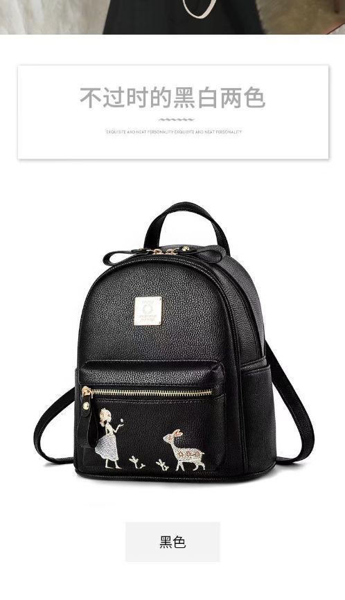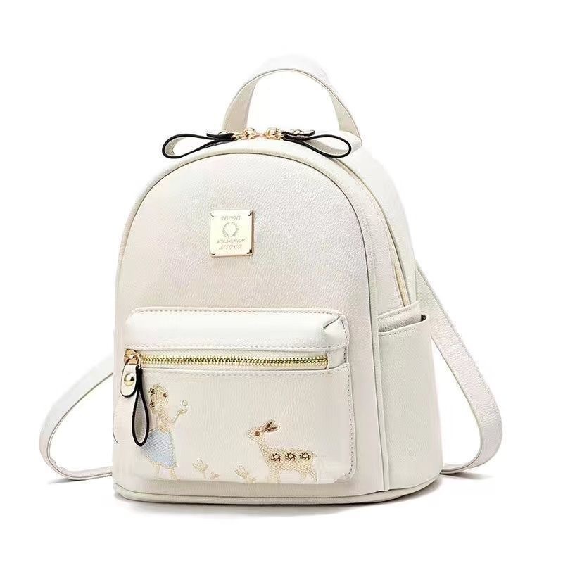 可愛らしい女の子と小鹿の刺繍が施された上品なレザーリュックです。